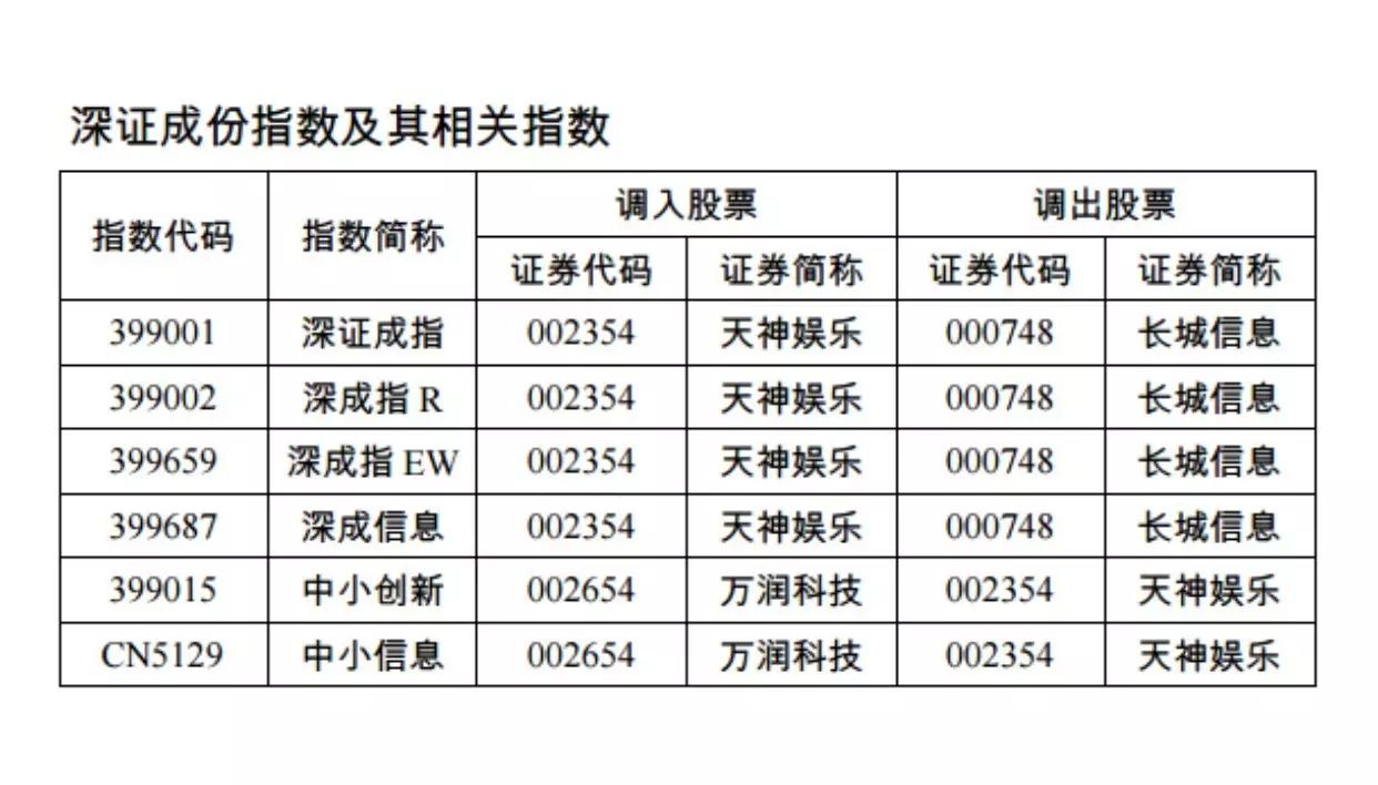 根據(jù)深圳證券交易所1月13日發(fā)布的《 關(guān)于調(diào)整深證成指等指數(shù)樣本股的公告》顯示,深交所決定于1月18日對深證成指、深證300等指數(shù)樣本股進行調(diào)整,其中將天神娛樂(002354)調(diào)入深證