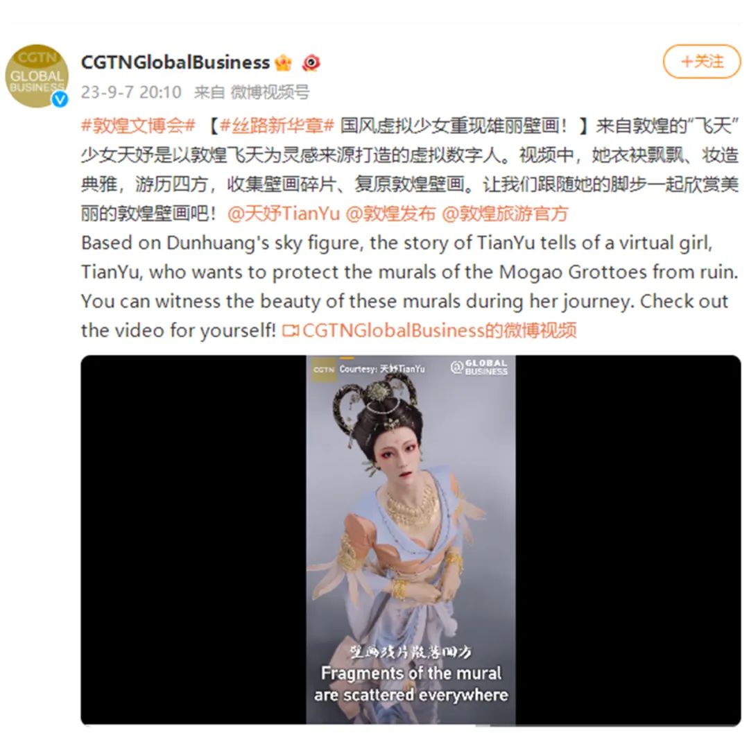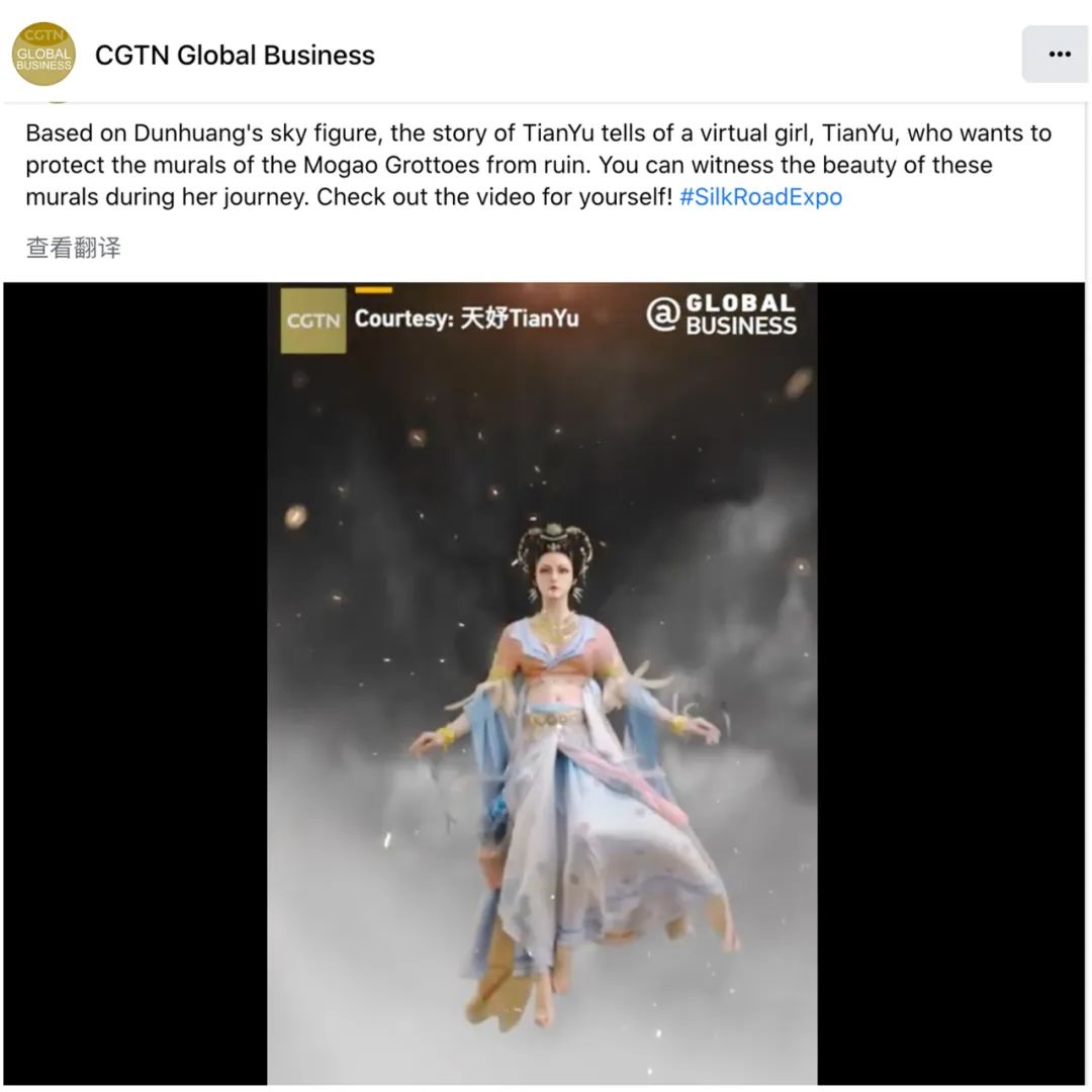 第六屆敦煌文博會期間,中國國際電視臺(CGTN)對天娛數(shù)科子公司元圓科技旗下虛擬數(shù)字人天妤進(jìn)行了連續(xù)三天的視頻推薦,在其Facebook,Twitter,YouTube、微博等多個官方賬號以及央視頻同步發(fā)布,助力天妤在海內(nèi)外的破圈,持續(xù)弘揚(yáng)中國傳統(tǒng)文化。